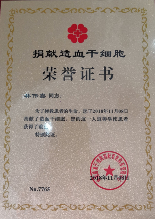 电话里说到,林伟鑫的造血干细胞与国内一名白血病患者配型初步成功,询问他是否有捐献意愿。在确定事情属实后,林伟鑫很快就作出了捐赠造血干细胞的决定。