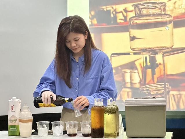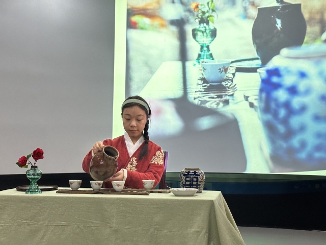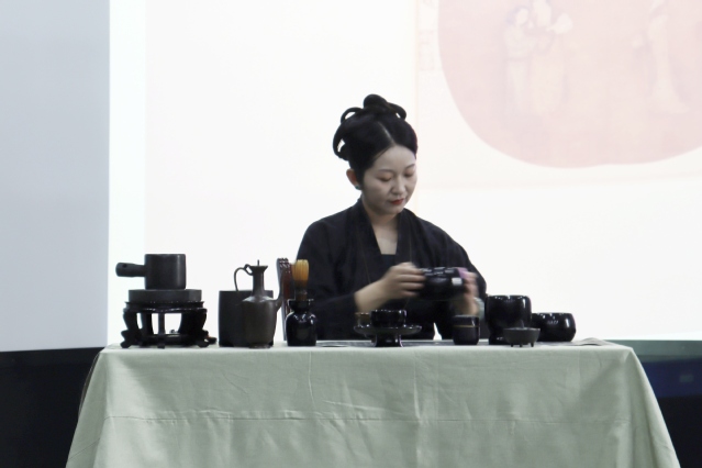五位展演者依次表演了宋代点茶、紫砂壶、盖碗、创意调饮和玻璃直身杯的冲泡技法,展示了团茶、普洱熟茶、姜盐豆子茶、红茶和绿茶等不同茶类的冲泡流程,为同学们带来了一场精妙绝伦的视觉饕餮。五场精彩的茶艺表演,老师们举手投足间尽显中国茶文化的意蕴。