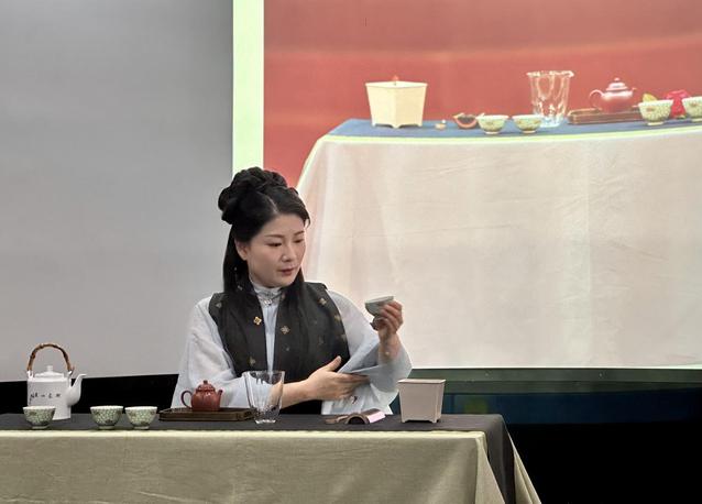 期间,刘佳老师从国人饮用茶的悠久历史讲起,简要地介绍了紫砂壶、盖碗和玻璃杯的使用方法,重点阐述了中国茶从史前、唐宋、明清的“有用”到现代的“无用”的发展历程,从“独乐乐”到“众乐乐”的社会属性的演变,从唐宋充满仪式感的喝茶形式到寻常百姓家的日常里的哲学嬗变。以深厚的文化涵养,幽默风趣地语言论述了对茶文化的认识与实践,既有理论学术高度,又不乏生活生产智慧,大家边品尝边赞叹,不时报以阵阵掌声。