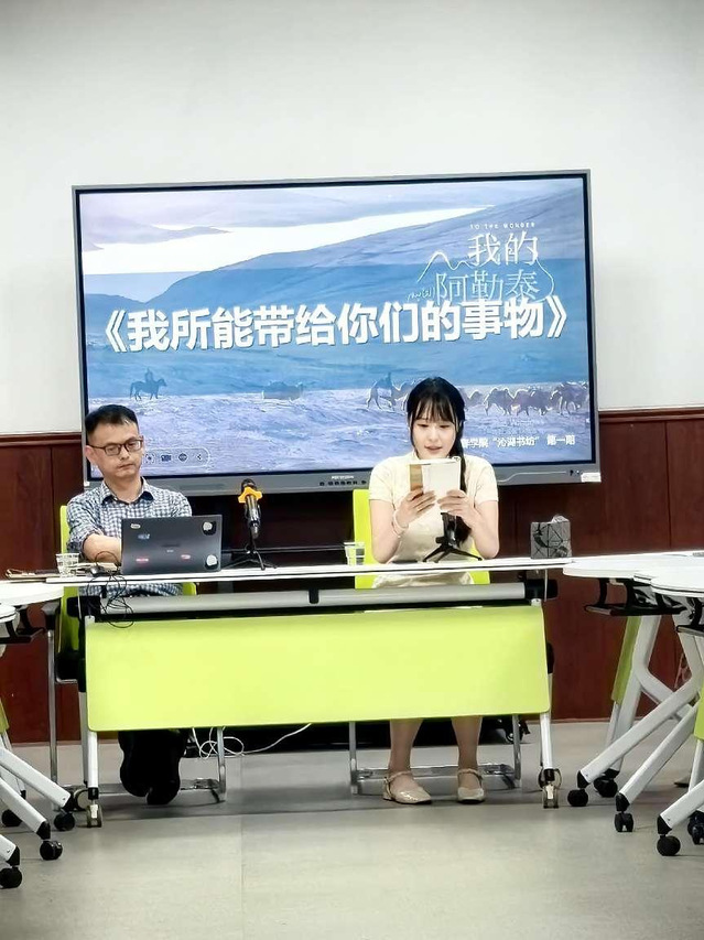 活动由文传学院教师邓娴主持,分为作品介绍、领读、解读、分享阅读等环节。整场活动,参与者们或为《我所能带给你们的事物》《想起外婆吐舌头的样子》等篇章的演绎而陶醉;或因解读者的介绍而理解《我的阿勒泰》的创作动因、主要内容和动人之处;或就阅读感受进行分享,在作品内容、少年经历、影视呈现等方面进行了诸多精彩阐发。有老师表示,自己是因为这个读书活动的预告而去读了李娟的作品,也有人喜欢读书,终于找到可以分享阅读感受的平台,希望“沁湖书坊”能持续地办下去。