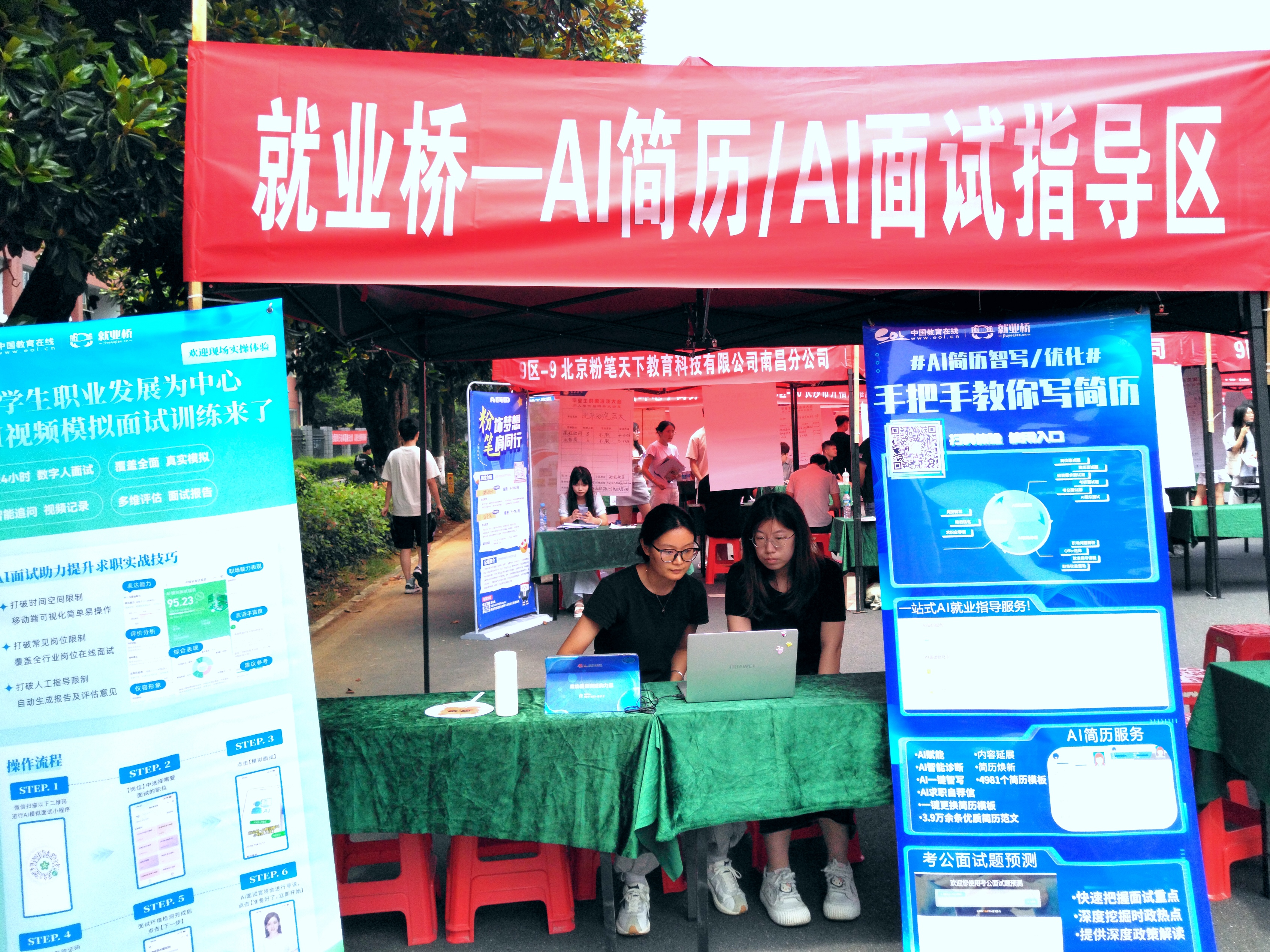 本次双选会特别设置了就业桥—AI简历/AI面试指导区、就业心理辅导与咨询区、就业创业政策咨询区、就业指导服务区等咨询专区。毕业生将简历上传至智能平台后,系统在3分钟内生成与目标企业匹配度达85%的定制化简历。数据显示,进行过AI面试指导或就业导师“简历问诊+模拟面试”的毕业生,其简历通过率提升了40%。就业指导服务区的范琛老师正在为毕业生进行耐心细致的现场就业指导;心理辅导专区的张欣欣老师正为毕业生定制“求职情绪管理方案”,“我曾因为面试紧张频繁失误,老师用‘系统脱敏训练’帮我重构应答思维,现在能够从容应对压力测试。”2021级网络与新媒体专业刘畅表示。