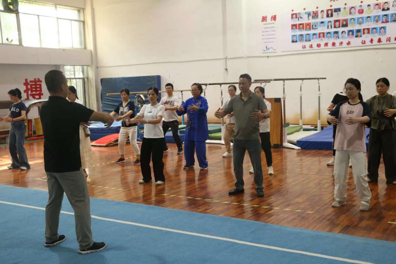 八段锦是我国从古流传至今的传统体育养生导引术,动作柔和连贯,兼具健身与养心效果,深受社会各界的欢迎。在体育学院老师的示范指导下,教职工们认真练习八段锦的各式、动作要领,一举一动尽显舒展与力量。