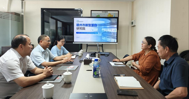 本站讯(生科学院 供稿)8月13日,校党委书记李国金率专家团队赴赣州市新型蛋白研究院考察交流,双方围绕产学研深度融合、技术创新与成果转化等内容展开深入研讨,共谋高质量发展新路径。生命科学与资源环境学院院长郭冬生、副院长肖花美、韩永强博士及药学院姜琼博士陪同考察。赣州市新型蛋白研究院院长张晓琳、技术总监杨小林、山行集团代表谢焘出席座谈。