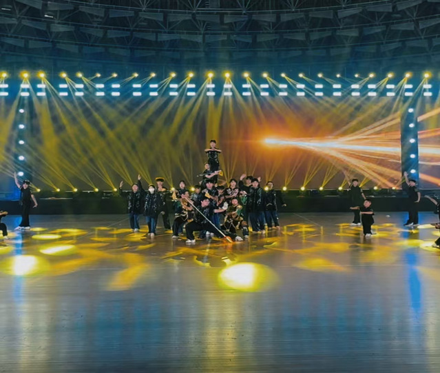 最后登场的《花火绽放》是舞蹈表演专业与宜春三中的跨界合作之作,以健美操为核心形式,生动诠释“青春如焰,向阳而生”的主题。在表演者中,既有体育学院擅长体能与动作编排的学子,也有宜春三中充满活力的青少年,他们身着统一的荧光色运动服,在舞台灯光的映衬下如同“流动的花火”。节目以“蓄力—绽放”为脉络,初始时表演者以低姿律动模拟“花火蓄力”,随后通过同步的跳跃、托举、队形散开,展现“花火升空”的动感;最终全员以高难度的集体造型定格,手臂舒展如绽放的火焰,与场馆内的灯光交相辉映,将现场氛围推向高潮。