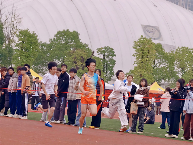 铅灰色的天空下,起跑线前的气氛凝重而专注。各学院运动员们凝神屏息,肌肉紧绷,宛如蓄势待发的弓。发令枪清脆的响声划破秋日的沉寂,一道道身影应声而出,毅然开启这场长达三圈半的征程。