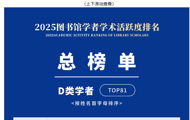本次排名根据学者的学术活跃度分数,将前10%的上榜学者精细划分为五个等级区间:前1%(A类)、前3%(B类)、前5%(C类)、前7%(D类)、前10%(E类)。其中,A类学者40人,B类学者81人,C类学者82人,D类学者81人,E类学者110人。易斌馆长成功跻身D类学者名单,标志着其学术活跃度进入全国同期参评学者的前7%,学术贡献与影响力获得图情领域的广泛认可。