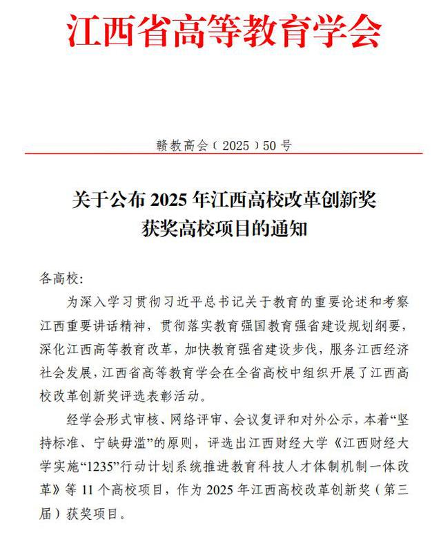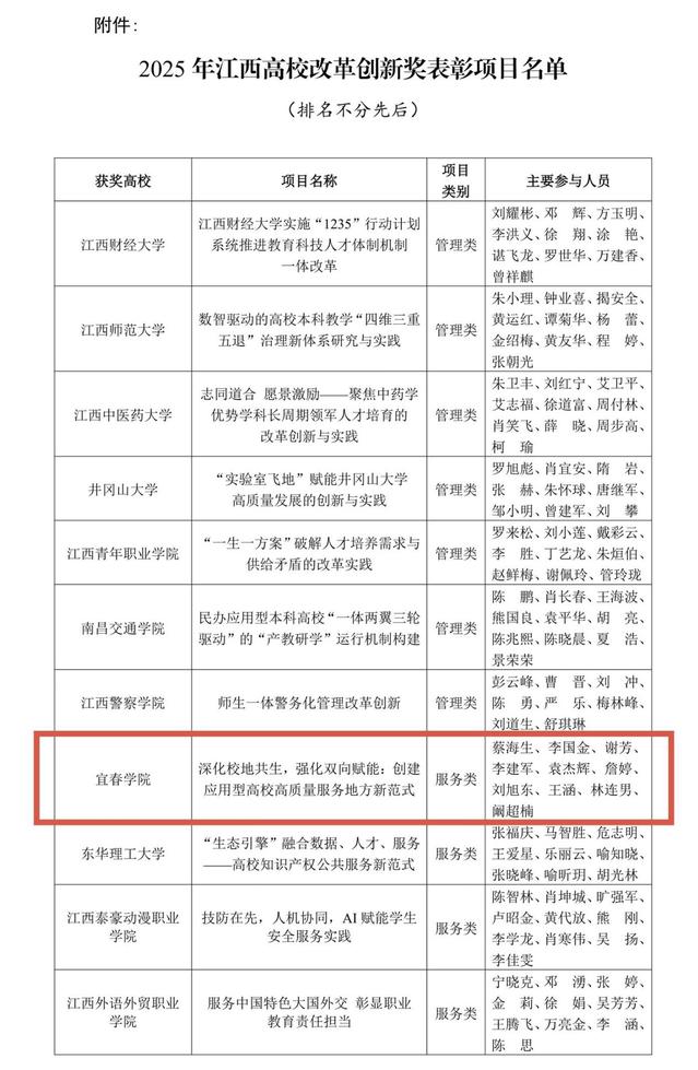 本站讯(科学研究处 供稿)近日,江西省高等教育学会正式公布了2025年江西高校改革创新奖获奖名单,开元申报的“深化校地共生,强化双向赋能:创建应用型高校高质量服务地方新范式”项目脱颖而出,成为本届获此殊荣的4个服务类项目之一。